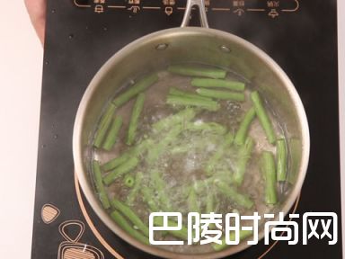 6锅中放入水,加1/2茶匙盐,放入豇豆过水捞出