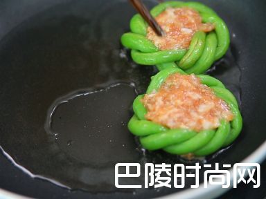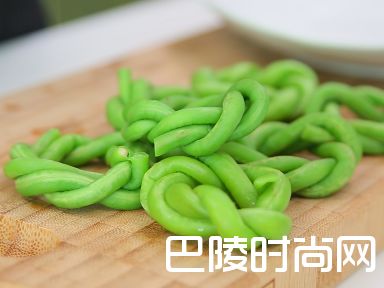 5将汆熟的豇豆以打结的方式绕成一个圈,裹上生粉。