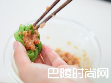 6将腌制好的肉酱塞在豇豆圈里。