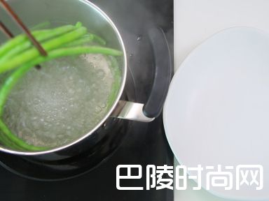 3豇豆洗净去头去尾后加入开水锅汆至翠绿色,捞出沥干水。