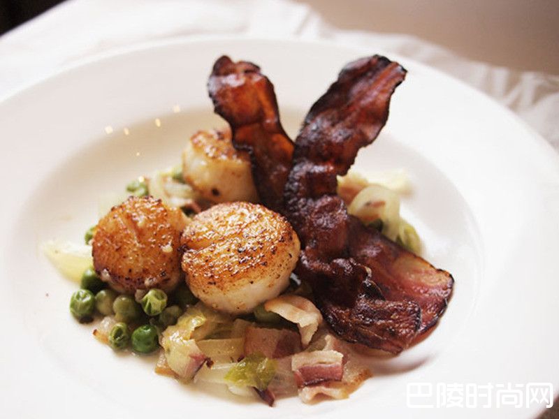 5将炖青豆铺在盘中放上干贝用煎好的培根片装饰,摆盘完成