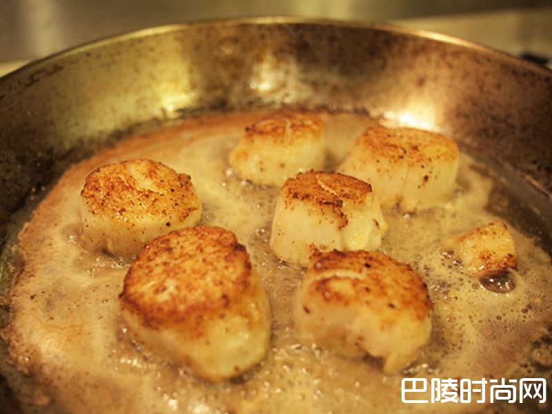 4步骤4在平底锅里放入可将干贝淹到1/3高度的沙拉油与奶油加热,加热至气泡变小,油也微微变色后再放入干贝,煎到背面色泽恰到好处即可翻面,边煎要边舀起周围的油淋在干贝上,待两面都煎到金黄焦糖色泽即可
