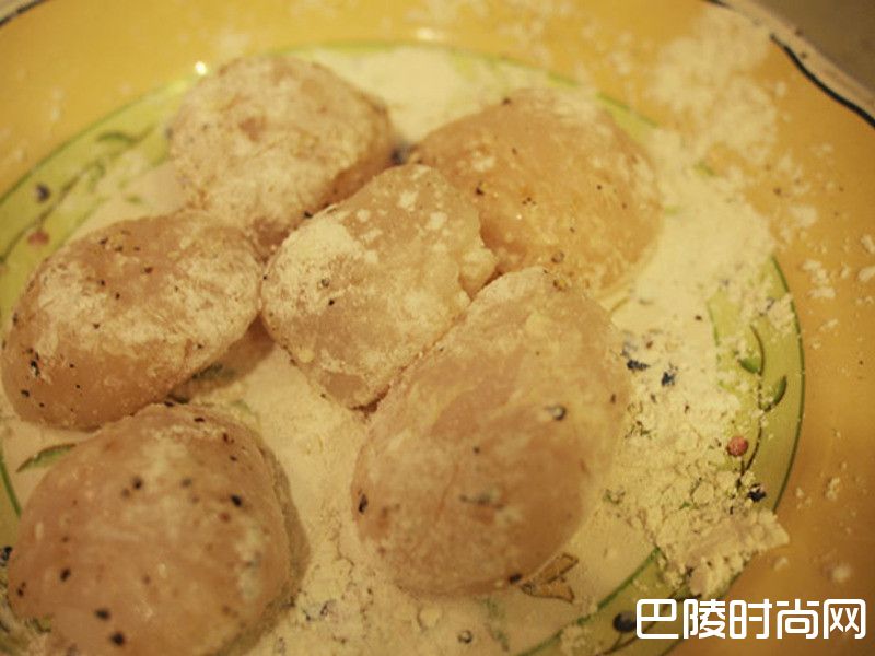 3将干贝水分擦乾,撒上盐与胡椒,沾上大量面粉再将多余的粉完全抖落
