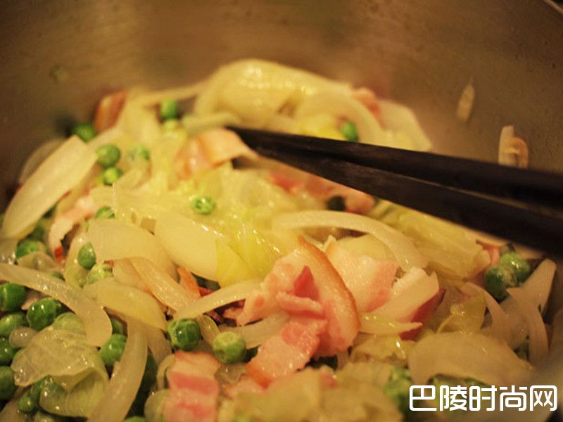 1步骤1制作炖青豆,先将10g奶油放入锅中加热,把切片培根放入拌炒,再将洋葱放入锅中不要炒到洋葱变色