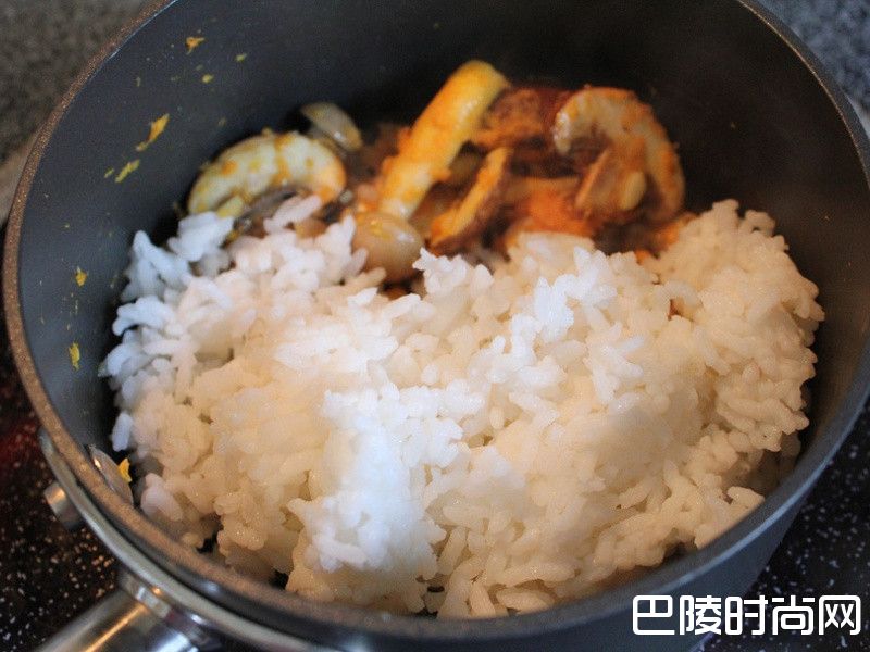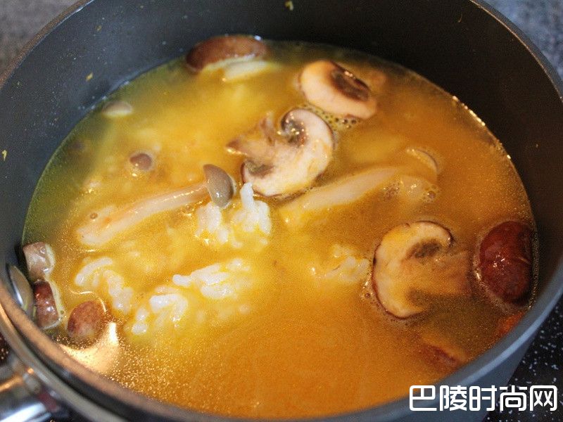 4用中大火煮3分钟后加冷冻青豆及适量鸡粉/黑胡椒粉调味 后盖锅盖闷2分钟即完成