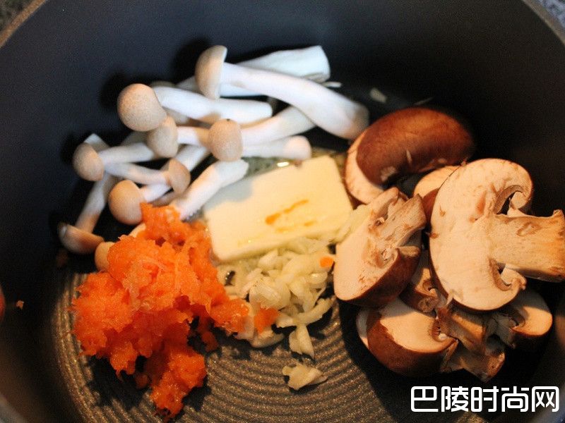 1少许奶油爆香蒜末, 菇类, 跟红萝卜丝