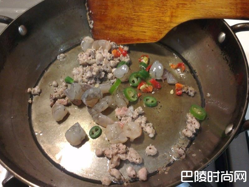 3绞肉块熟时,加入虾仁与辣椒一起炒