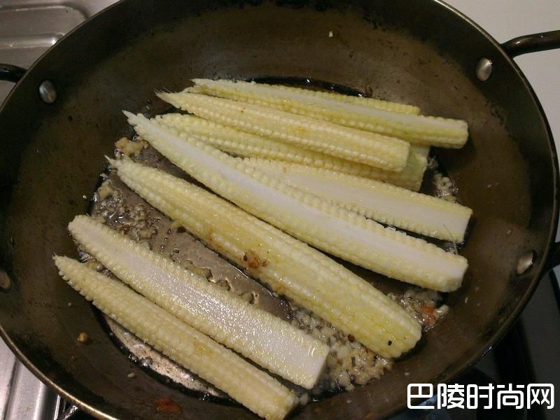 5同一锅再加入少许的油,加入蒜末与玉米笋拌炒,加入半杯的盖锅盖至汤汁快要收乾,在调味即可