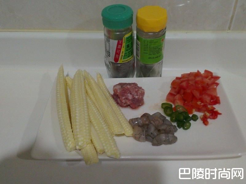 1主要食材:先将虾仁,番茄,辣椒切丁,玉米笋对切