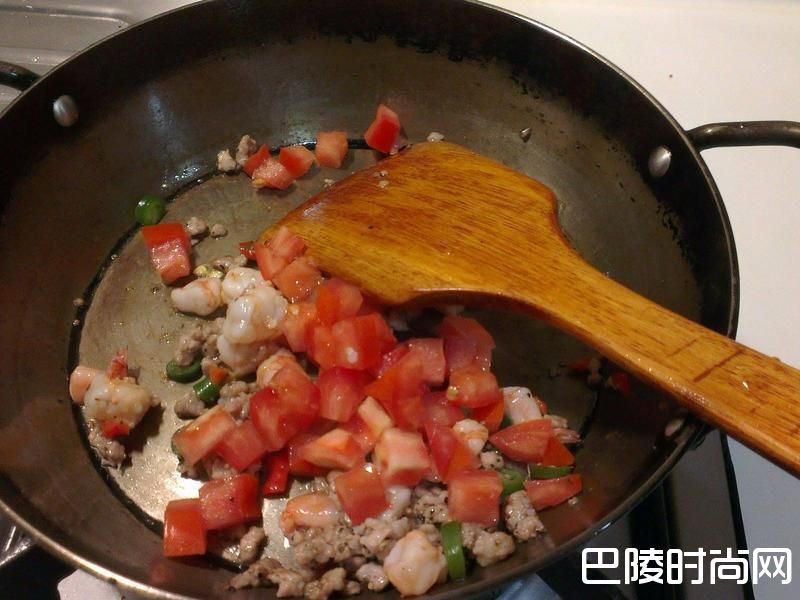 4虾仁七八分熟时加入少许白酒,再加入番茄及调味盛出