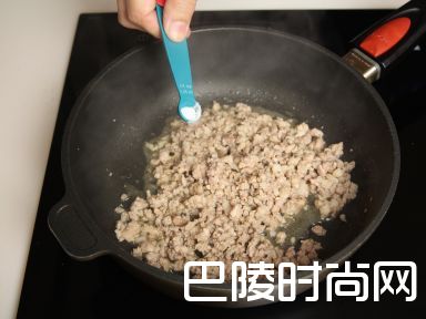 5在炒锅里以高火加热适量油,放入肉碎炒至半熟,需时两分钟