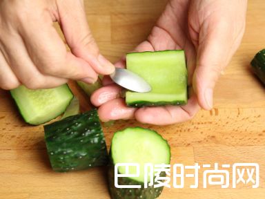 3将青瓜洗净沥干,切成3厘米长的段。再对半切,取出籽