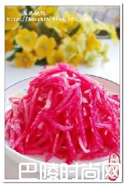 做法1.心里美萝卜半个削皮,切丝。