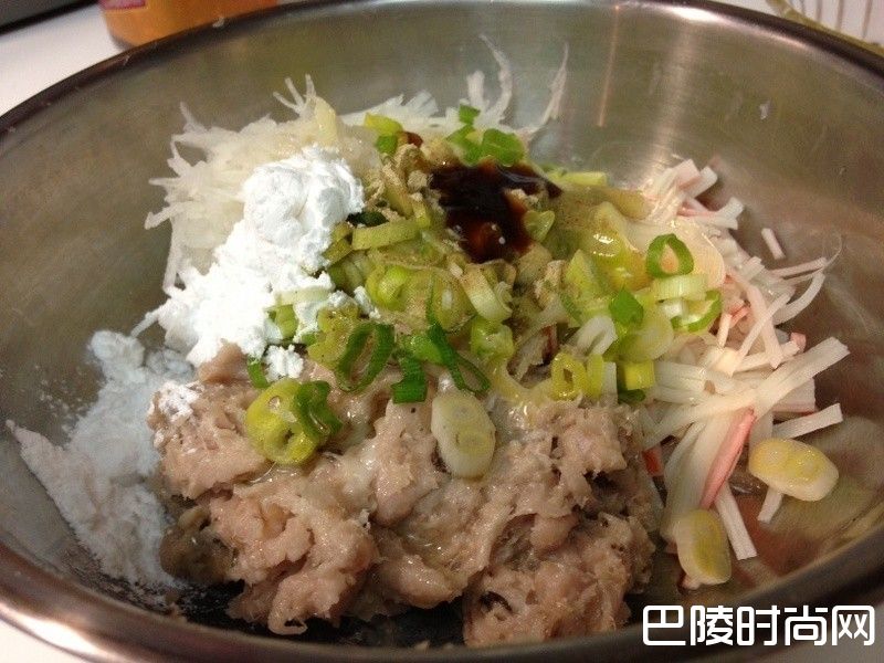 2香菇饺用手捏成泥状馅料,蟹肉棒先剥成一丝一丝后切成小段,再加上萝卜丝、葱末、蛋汁和调味料充分混合均匀。(因为香菇饺本身的调味已经很足,所以这边调味料的份量不需要太重:))