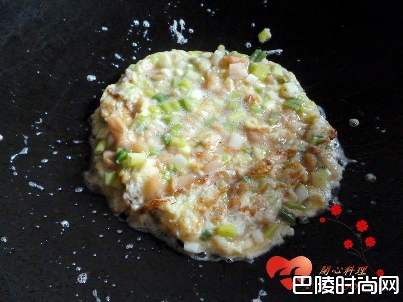 4倒入蛋液用中火搅拌至7分熟时,整成圆形