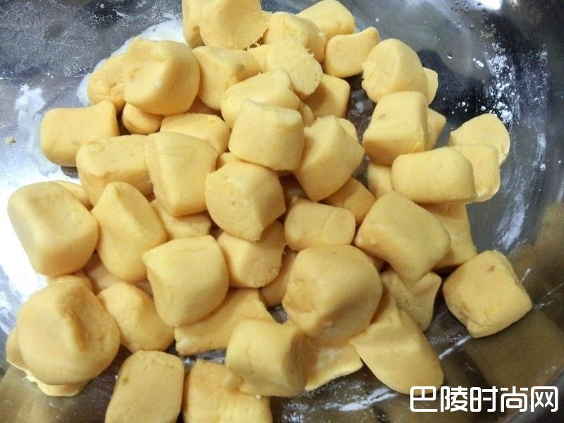 3待搅拌差不多(不会黏住容器),就可以搓揉呈长条状再切成1.5-2公分的小方状(形状可依照自行喜好)。