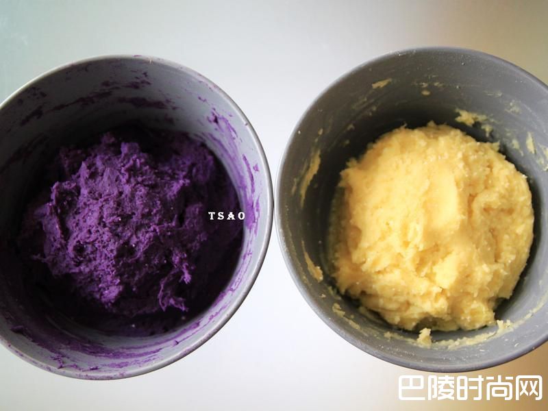1地瓜去皮切小块,放入蒸锅蒸熟,趁热压成泥状并加入糖及奶油拌匀。