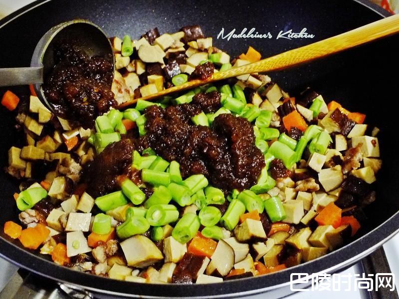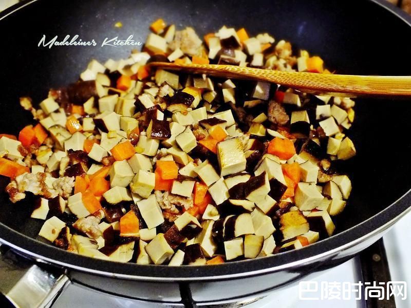 4再倒入豆干丁,红萝卜丁拌炒片刻..