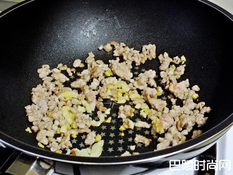 3将绞肉入锅炒散,炒熟~油脂出现后加入蒜姜末爆香。(若绞肉较瘦的话,可加一小匙油同炒)