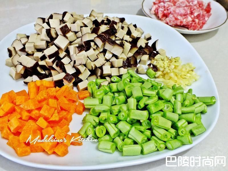 2蒜.姜切细末备用,豆干,四季豆,红萝卜分别切小丁状备用。(四季豆,红萝卜可先稍微烫过,不汆烫,后续直接加入拌炒亦可。)