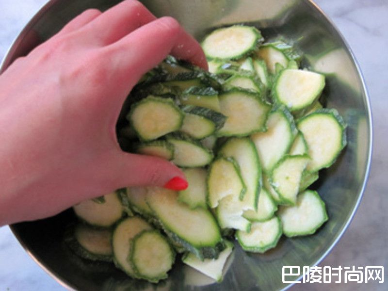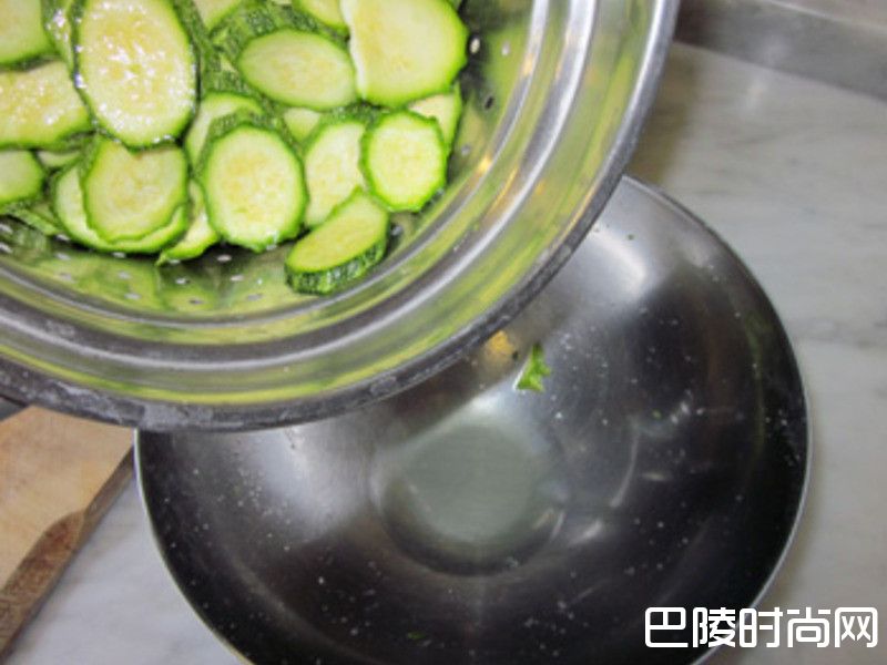 2见图: 底锅内的水都是节瓜释出的水分. 这个抹盐脱水的动作常见在义大利的节瓜和茄子料理, 目的是要避免蔬菜在烹煮过程中释出太多水分, 影响成品的口感和状态.