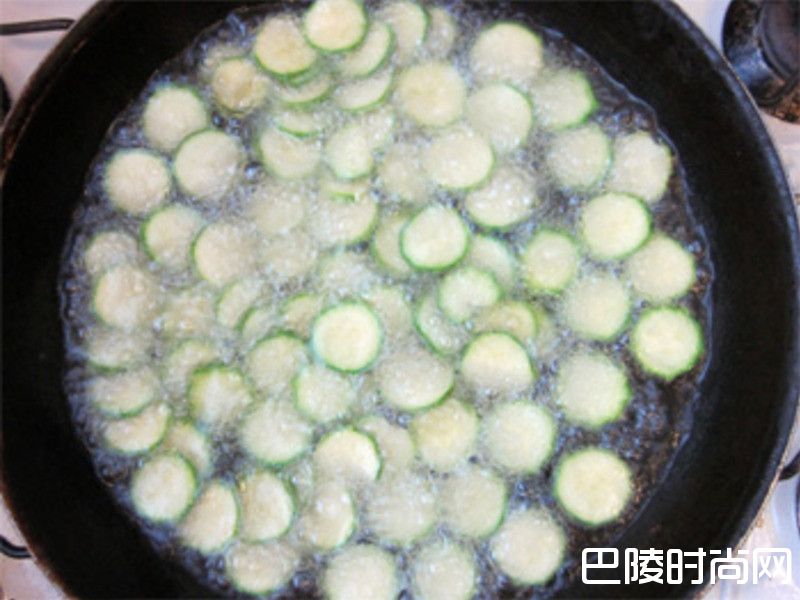 5油锅中火加热. 放入一小片节瓜, 马上浮起并有大量油泡出现就表示温度足够. 放入所有节瓜片, 中火由炸并且持续搅拌翻面直到每面都成金黄色时就可捞起.