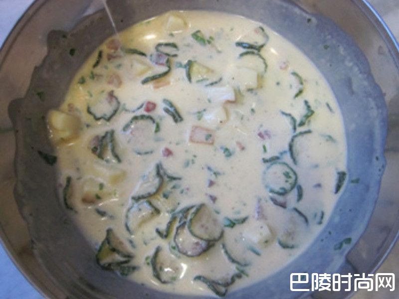 7油锅不要熄火, 将培根丁放在沥油勺上, 放入热油中30秒, 炸香后马上捞起.