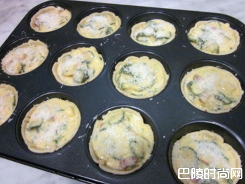 11将内馅平均分配到12个派皮中, 最后撒上些许帕马森起司粉和少量黑胡椒. 以180度烤25分钟, 或直到表面呈现金黄色即可. 出炉后, 静置30分钟再食用!
