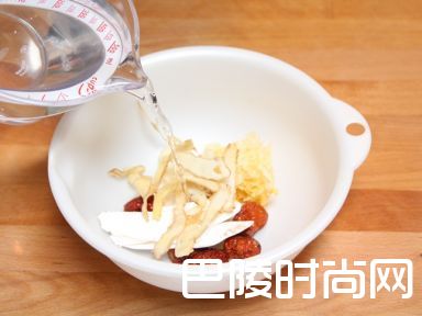 2另一个碗中将玉竹,红枣,淮山和木耳混合,加入适量水泡30分钟