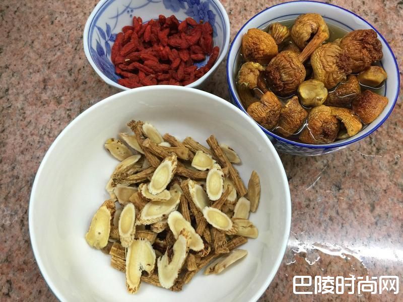 。清洗茶树菇、黄芪及党参,并用清水浸10-15分钟。此作用乃将茶树菇泡开,去除中药里面的杂质,使药材变软,有效成分容易煲出来。