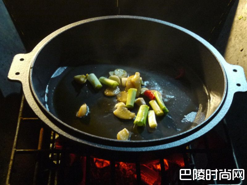 2锅内倒入麻油热锅,放入蒜头、辣椒、葱片爆香。