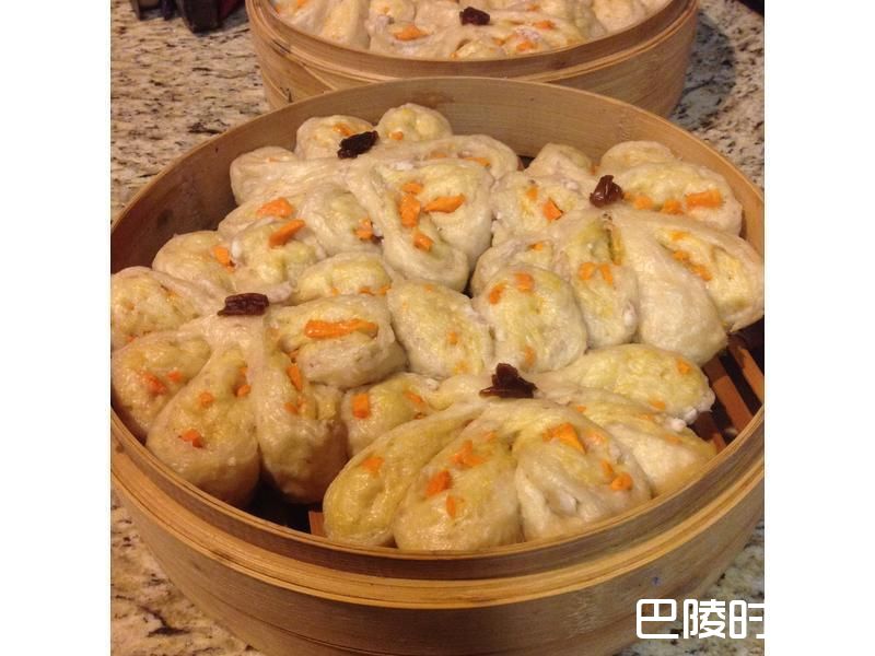 38蒸好后的大朵紫芋头橘地瓜花花馒头..
