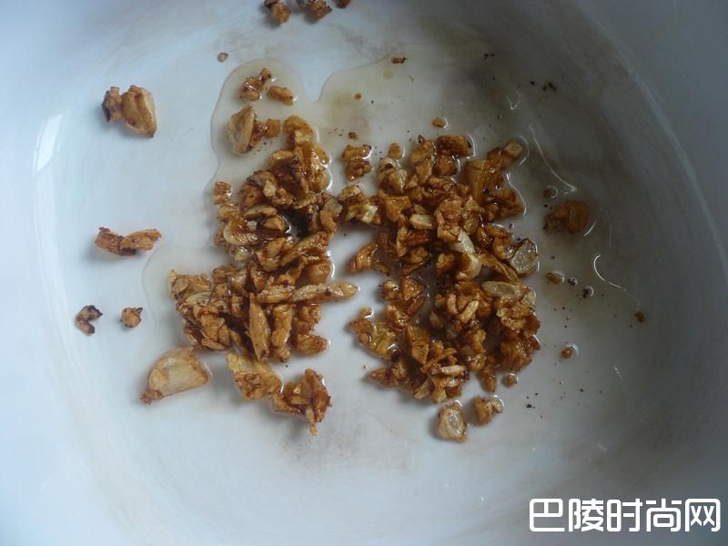 取出,将蒜头去老膜,切成蒜末;热锅放入橄榄油,油温提高即可放入蒜末,以中小火炸酥蒜末,待蒜末变金黄色时,将盐巴和酱油一起放入,即可熄火备用。