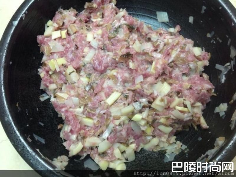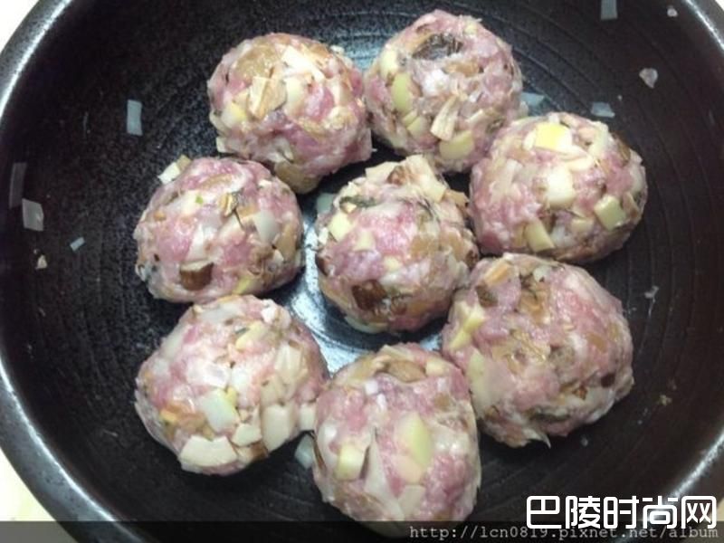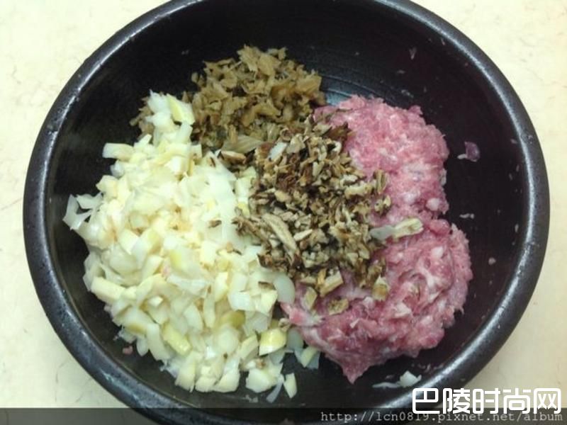 1绞肉拌搅至有黏性,梅干菜、桂竹笋、香菇川烫切细末