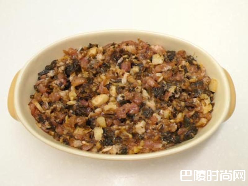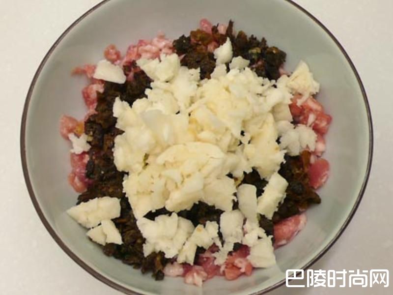 4肉馅加酱油、米酒&盐同一方向搅拌至略出筋,放入梅菜碎、荸荠碎、太白粉水拌匀