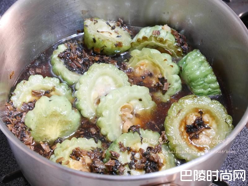 5煎好的苦瓜和酱油入锅,加水至稍微可以醃过苦瓜的高度,中大火煮滚,试试咸度并以酱油调味,转小火煮20分钟左右。