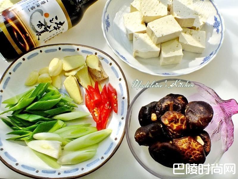 4接着放入香菇煎香..同时爆香蒜苗.姜片与辣椒蒜末,再将煎过的鸡腿肉放入拌炒均匀..并淋下淬酿酱油露.绍兴酒炒香~最后放入煎过的豆腐并加入适量的水(刚好淹盖过食材即可)烧煮约10~15分钟..让全部的食材入味。