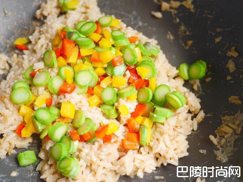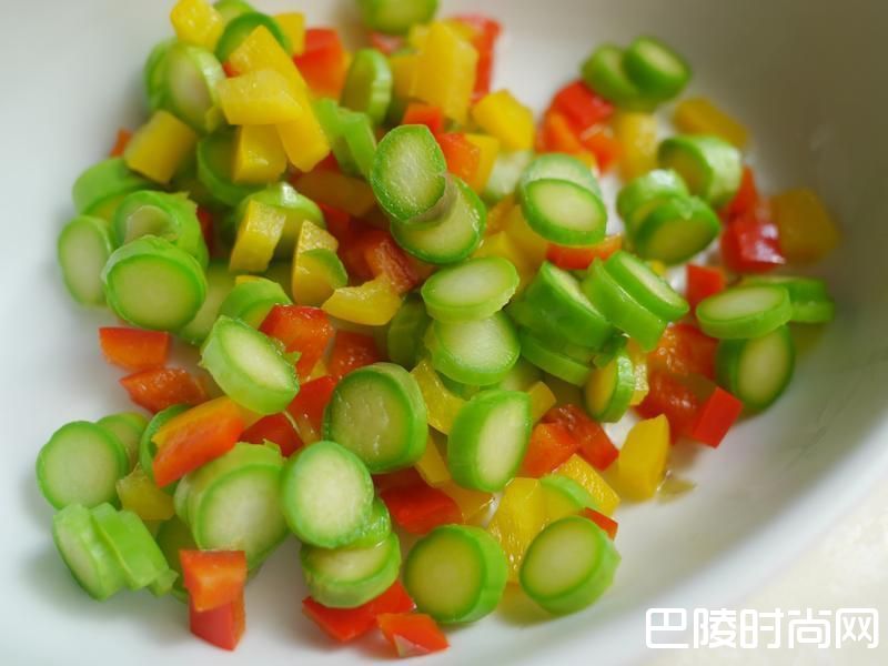 3黄红椒丁、芦笋丁烫后浸冰水沥干备用