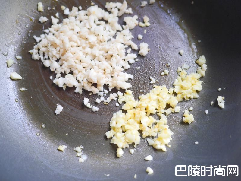 5奶油加热,放入蒜末炒香后再放入香菇肉碎炒香