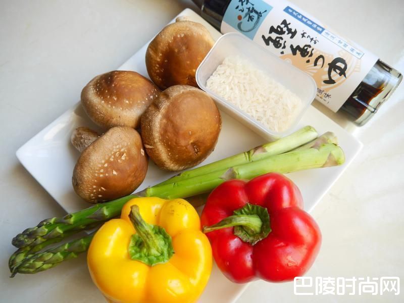 1准备食材:新鲜香菇、泰国香米、淬酿日式和风酱油露 _静冈鲣鱼、黄、红椒丁,芦笋丁