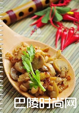 2.锅内底油烧至三分热,下鸡肉片滑炒熟,再把口蘑倒入,滴入少许生抽和一点点盐炒匀出锅。