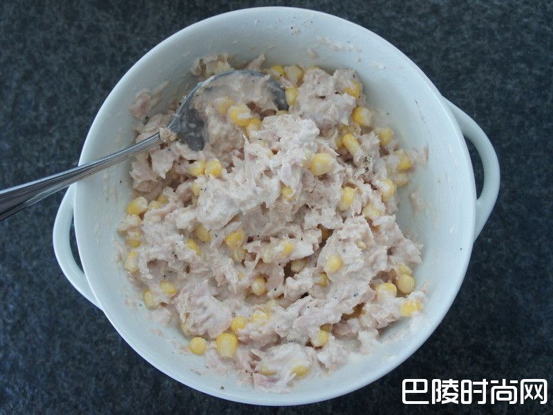 1 滤掉鲔鱼罐头内的盐水或浸油,再将鲔鱼玉米馅所有材料