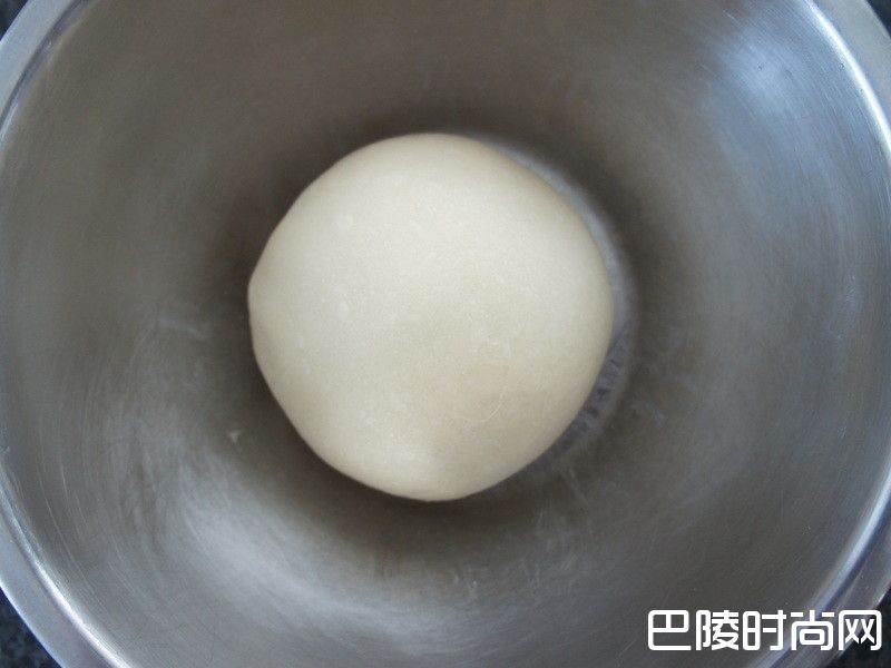 3打好的面团用手滚圆后,放入已抹油的钢盆内,再盖上保鲜膜,放到温暖处进行第一次60分钟的发酵