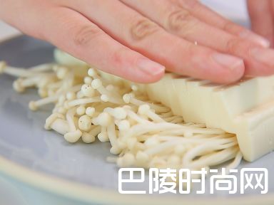 2将嫩豆腐切片扑在金针菇上
