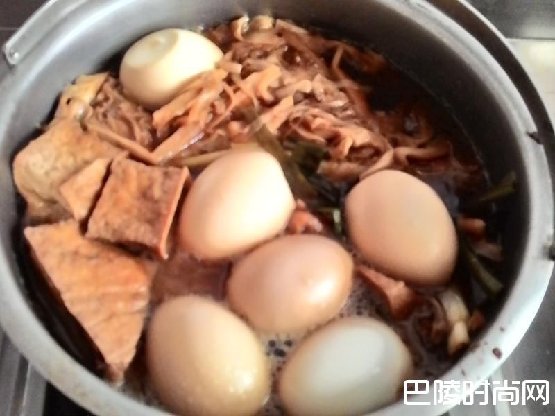 5水滚后倒入笋干,蛋,油豆腐,转小火卤20分盖著锅盖闷1小时~在开伙煮5分在闷一段时间即可食用