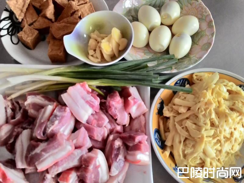 1五花肉切适当的大小,水煮蛋剥好壳,笋干洗净,油豆腐及辛香料也备妥