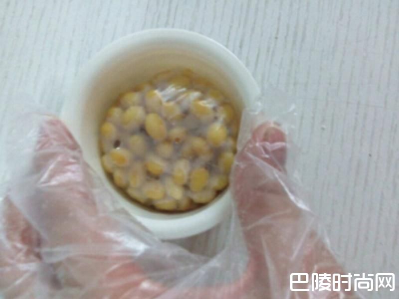 7接种纳豆菌,1.取一小包纳豆菌打开后将菌粉倒入小杯,用5-10毫升纯净水或凉开水化开。2.把蒸好的黄豆滤干水倒入盆中,再将菌液加入热豆中,同时用勺子不停搅拌,使黄豆受菌更均匀。(1.热豆最好在70度以上温热状态下接种菌粉液;2.操作时请带上一次性手套)