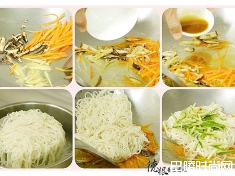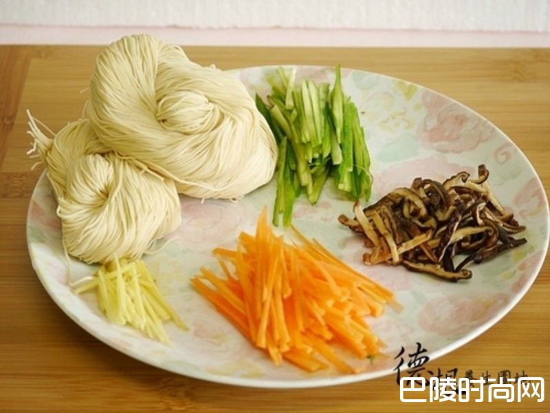 洗净,香菇泡软与小黄瓜、红萝卜及姜全部切丝备用。