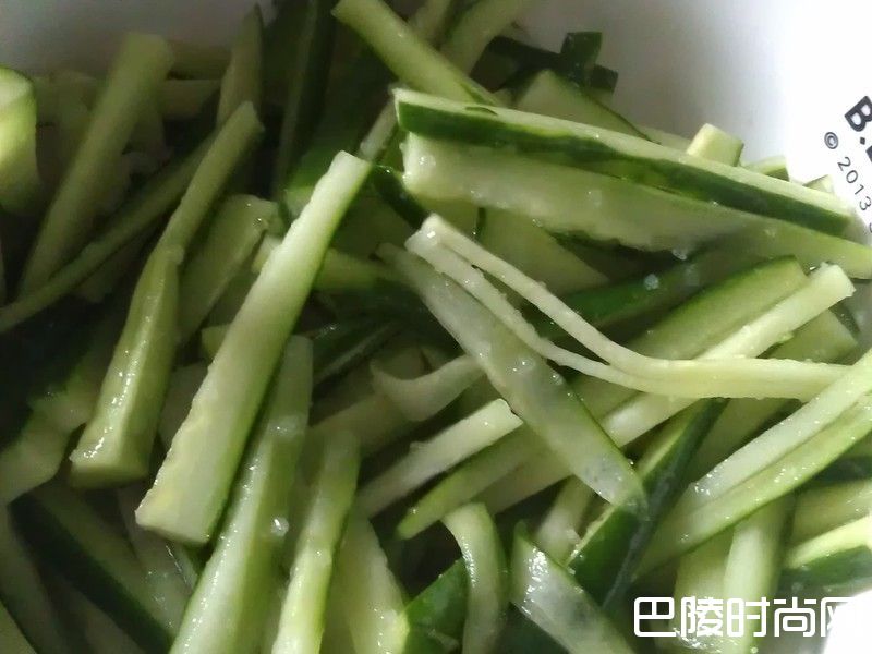 4将小黄瓜切丝, 加入少许盬, 并等待30分钟让它出水!出水后拿出青瓜, 把水倒掉!