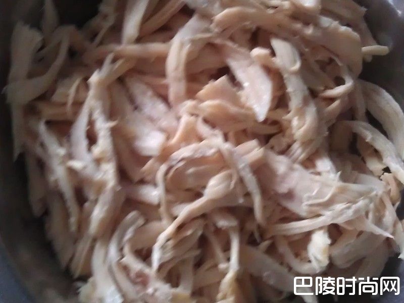 3等鸡肉稍微冷却, 开始用手撕成鸡丝